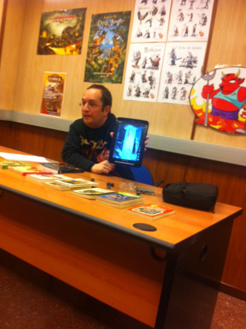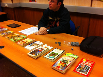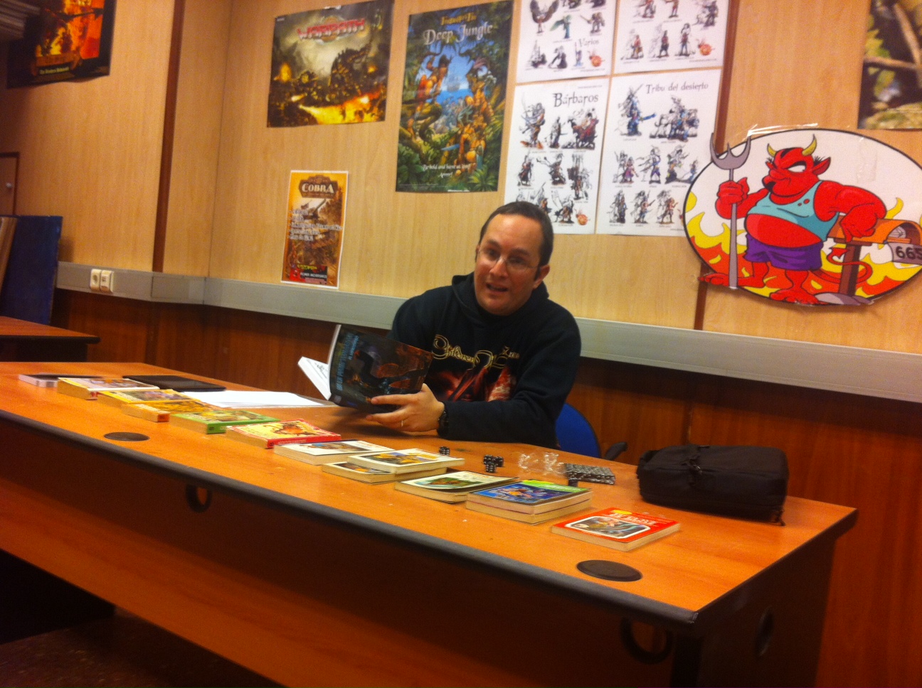 La presentación estuvo al cargo de Fernando Lafuente, quien realizó una charla previa comentando el pasado, presente y futuro del libro-juego. Tuvo sobre su mesa una nutrida representación de varias líneas y publicaciones de hace ya bastantes añitos, como "Elige tu propia aventura", "Lobo solitario", "Planea tu fuga", "La máquina del tiempo" o "Dungeons & Dragons", entre otros; todos ellos títulos míticos que muchos que pasamos ya de la treintena conocemos muy bien.